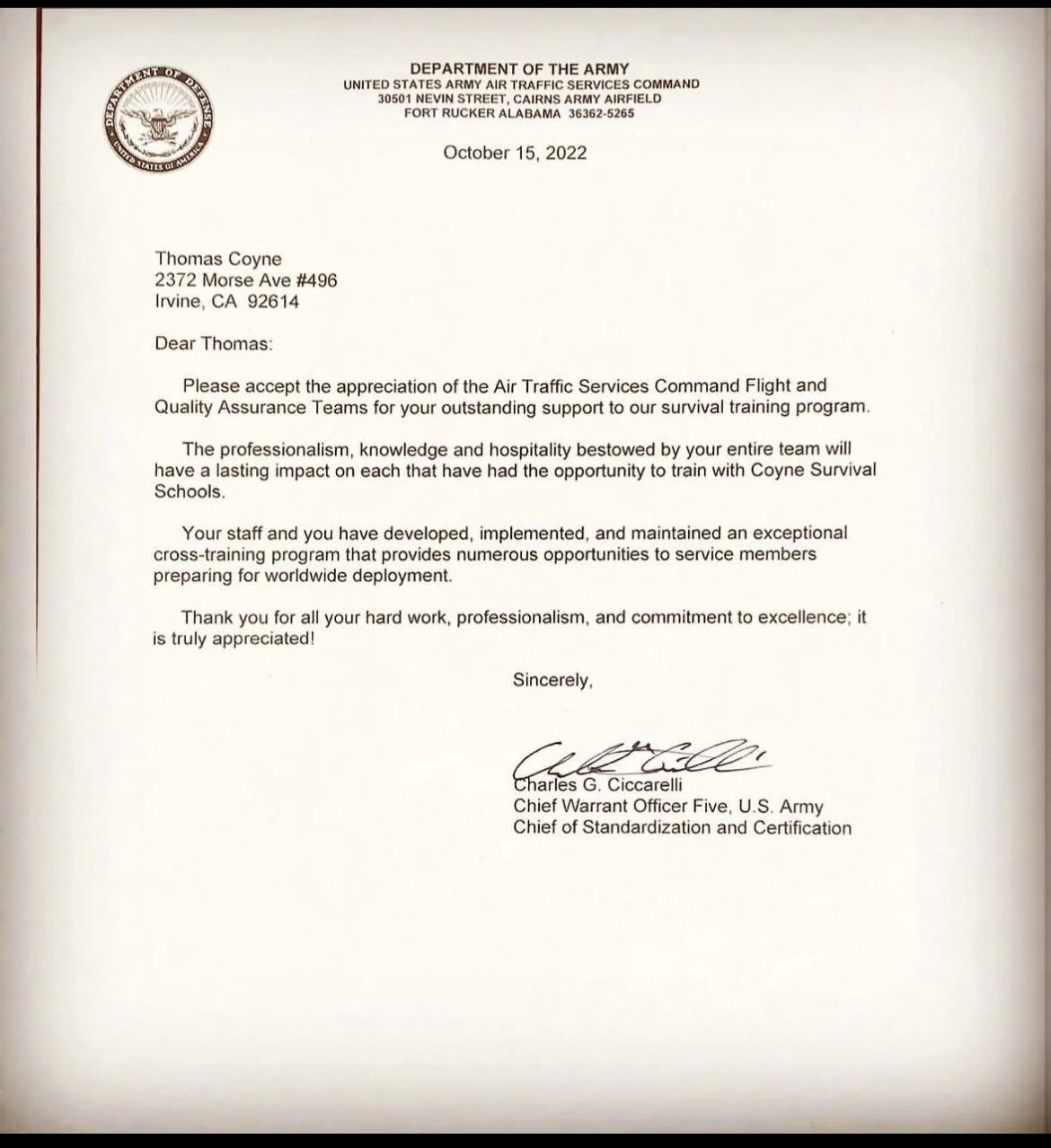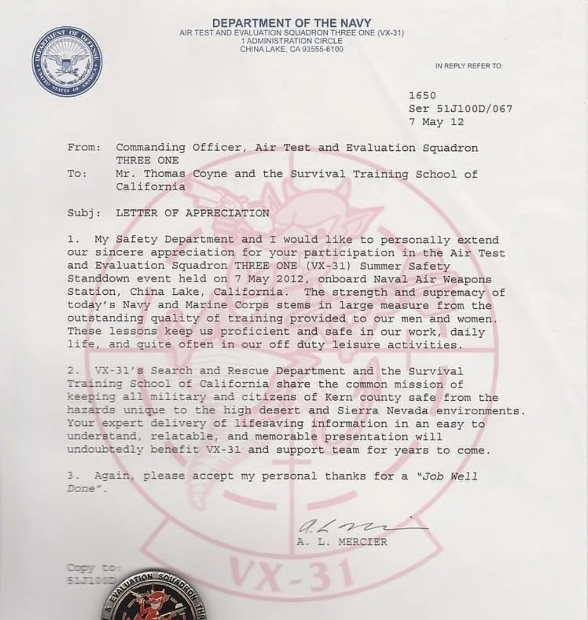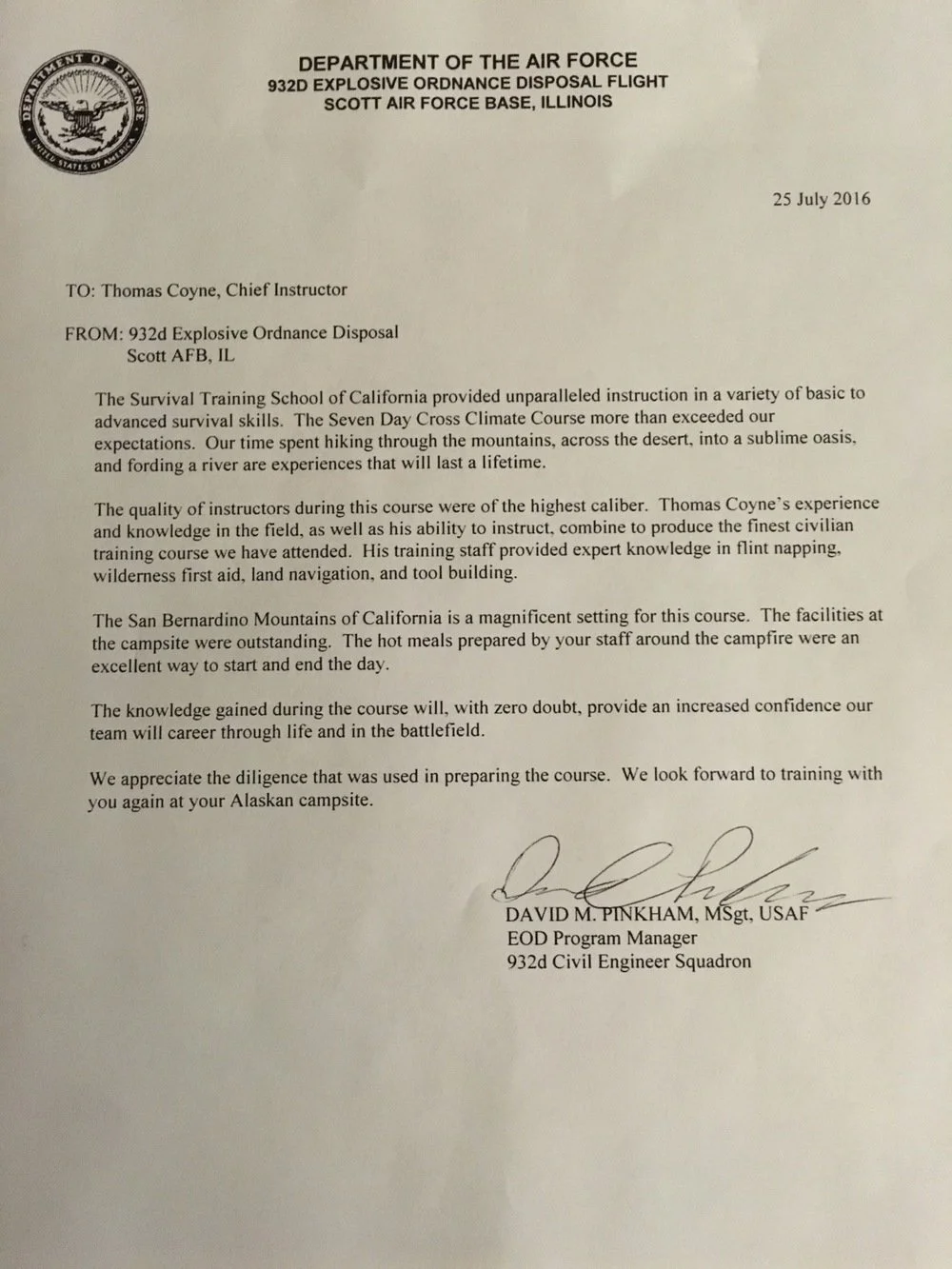 “The instruction during your course was extraordinary. You exceeded all expectations as a survival instructor, and earned the respect of the Marines.”